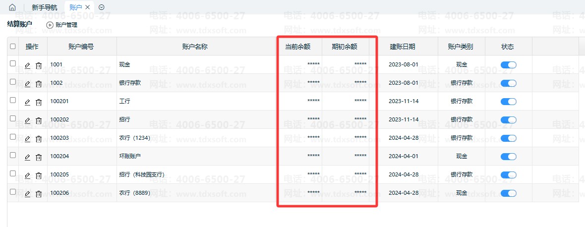 同理,未勾选【余额查看】,在【账户】列表不会显示当前余额和期初余额。