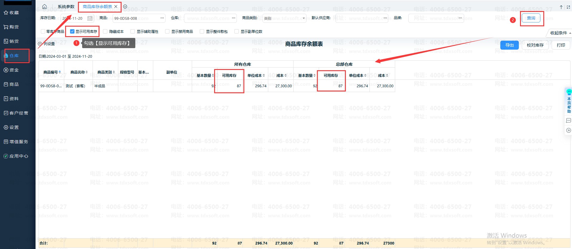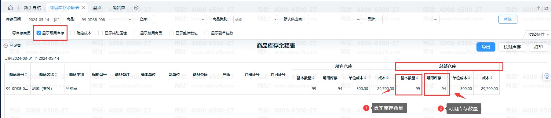 在【报表】-【商品库存余额表】勾选“显示可用库存”查询真实库存数量和可用库存数量。