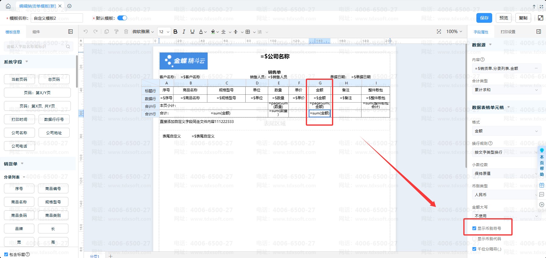 2、云进销存目前单据及报表查询界面暂不支持显示币别符号;单据可通过自定义打印模板勾选 “显示币别符号”,在打印时同步显示该符号。
