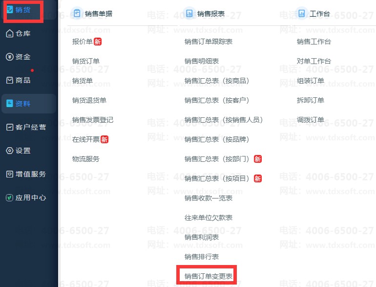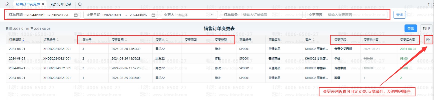 在购货订单和销货订单进行变更操作后,可分别通过采购订单变更表和销售订变更表查询所有订单的变更记录及变更详情,并将查询的内容打印或导出。