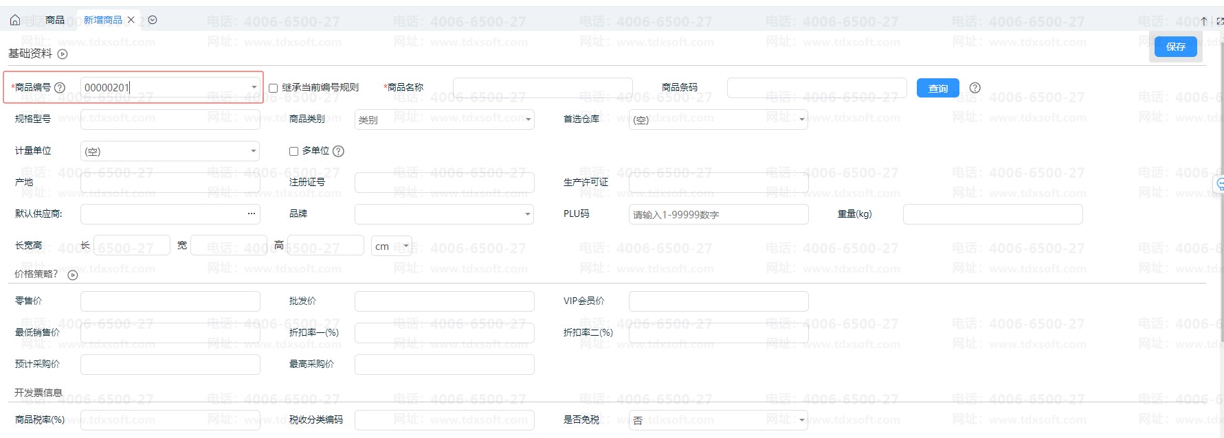 在新增商品的详情界面,可输入商品编码,如图: