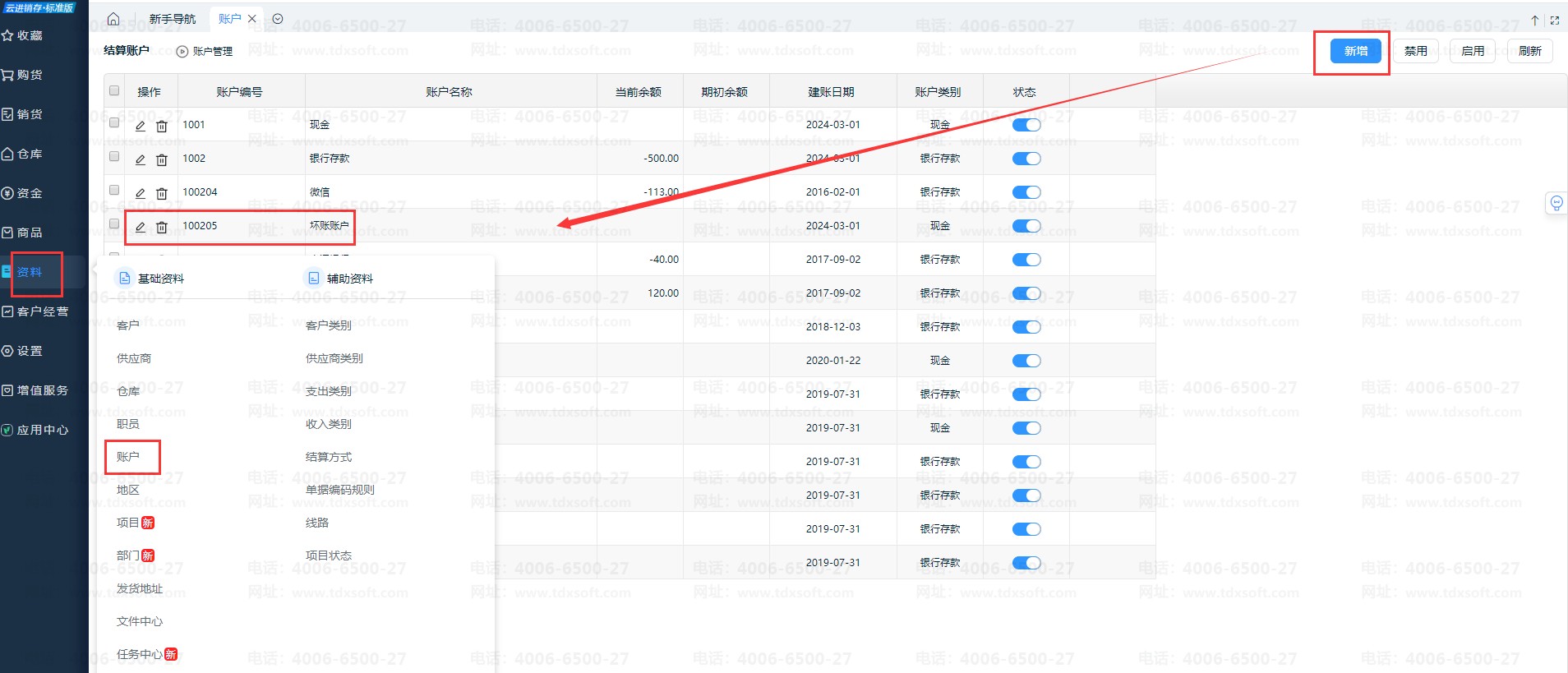 ①在【资料】-【账户】新增账户,如“坏账账户”