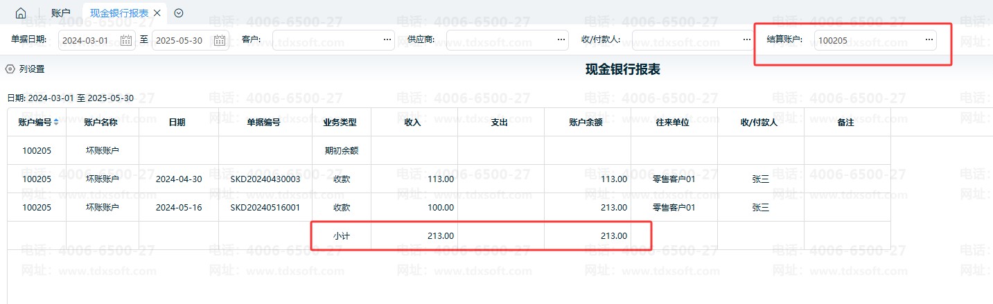 后续可以在【资金】-【现金银行报表】中,通过“坏账账户”结算账户统计查询总的坏账金额。