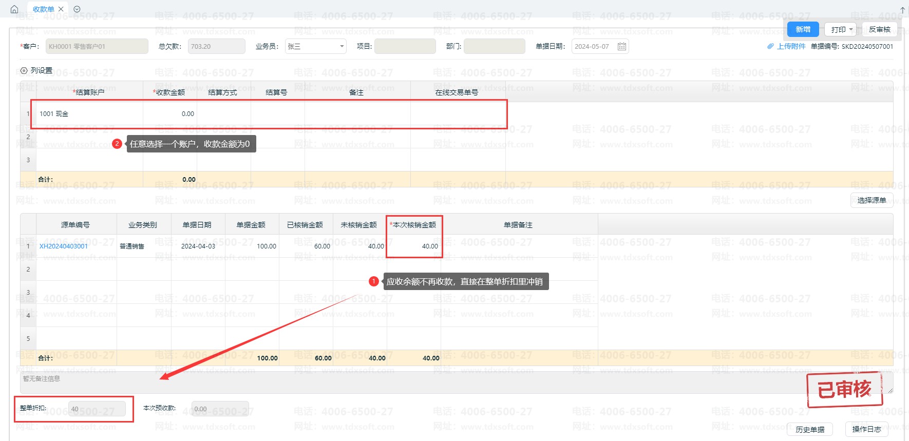 ①新增【收款单】,选择对应的销货单源单,在【整单折扣】填上此单坏账金额,如图所示,销货单的应收余额40元不再收取,做为整单折扣录入40元。