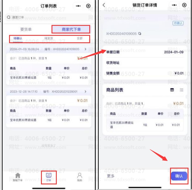 商家登录精斗云协同助手小程序,代客户下单后,客户即可在【商家代下单】查看到;并对销货订单进行【确认】。