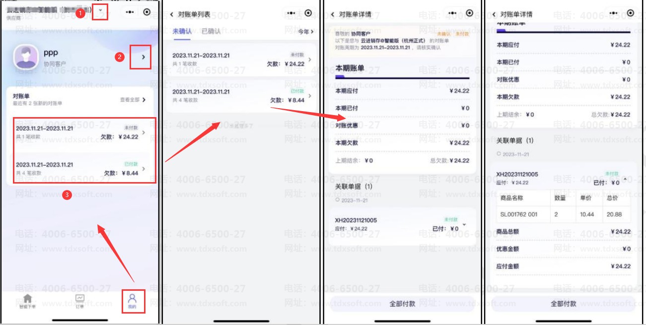 全部的对账单支持按未确认,已确认的对账单进行筛选;对账单详情显示对账双方的客户信息,对账周期,显示本期应付、本期已付、对账优惠和本期欠款金额,上期的结余金额和总欠款金额;关联的单据里主要存在销货单、其他收入单和销货退货单、每个关联单据可点击查看详情。