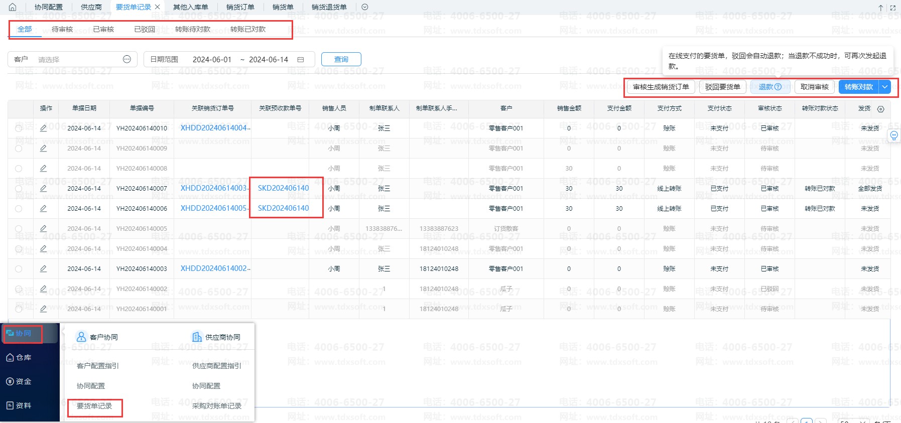 ③在线支付的要货单,驳回会自动退款;当退款不成功时,可再次发起退款。