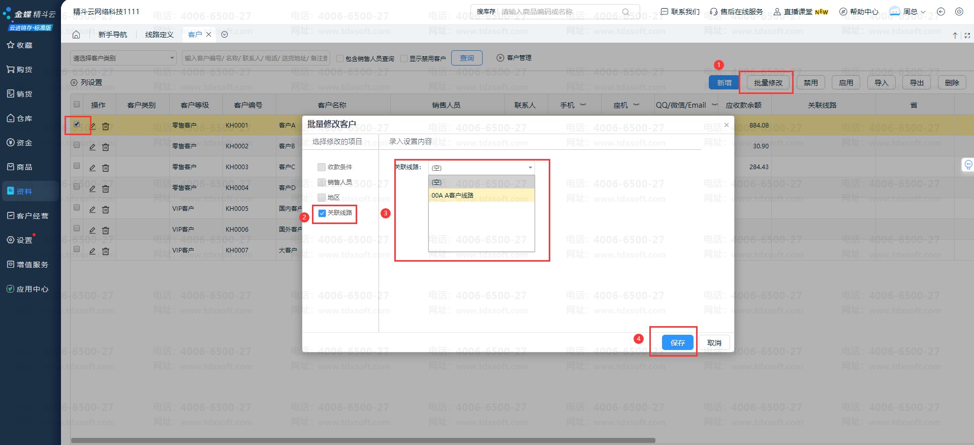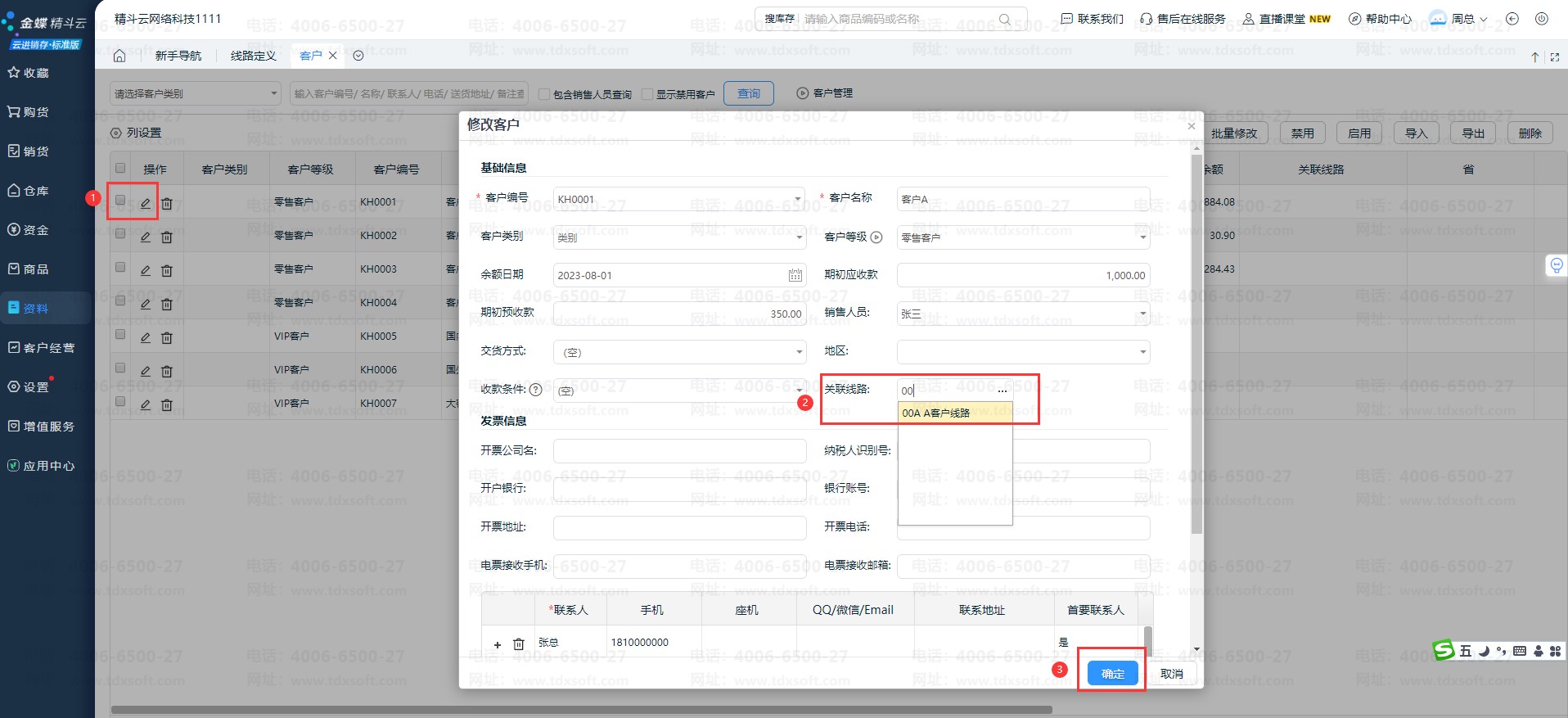 ②单独设置线路:依次点击【资料】-【客户管理】在客户管理界面选择需要关联线路的客户点击修改,在关联线路字段选择需要关联的具体线路后点【确定】。