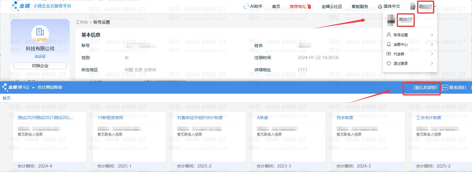 1、登录需修改姓名的账号,精斗云官网(http://www.jdy.com)工作台页面,点击右上角的名字,再点击【账号设置】进入账号设置界面。