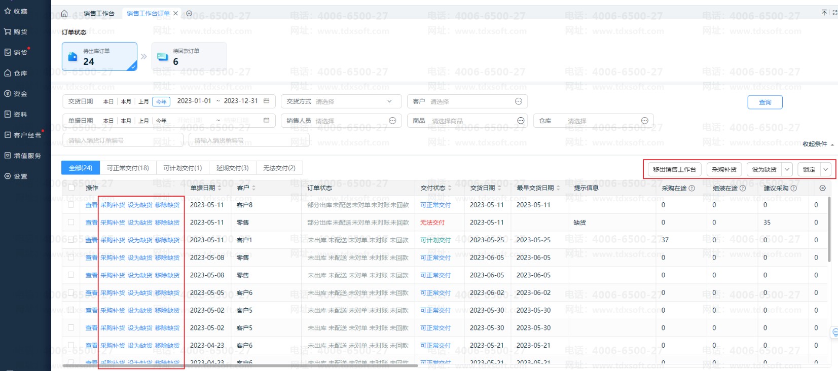 若订单无法按时交货,可点击【设为缺货】,交付状态会变为“无法交付”;后续商品到货后可【移除缺货】