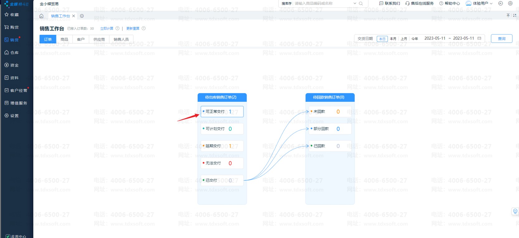 打开【销货】-【销售工作台】,默认展示交货日期为“本日”的订单情况,右上角可切换查询日期。