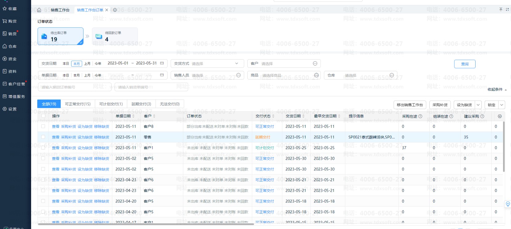 延期交付:代表该销售订单不能在约定的交货日期交付,需要补货且延期后才能正常交付