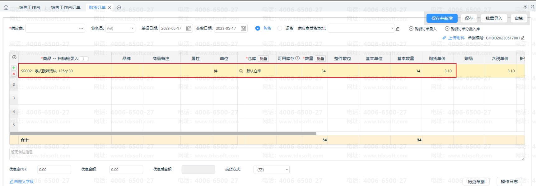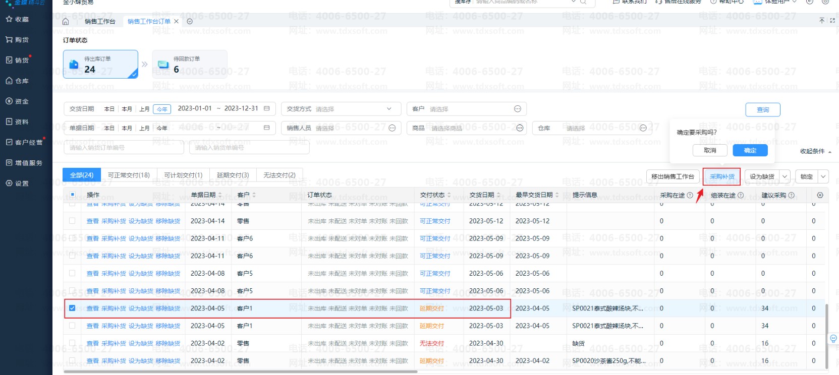 选择无法正常交付的订单,点击【采购补货】,自动带出需要补货的商品并填充数量、价格等