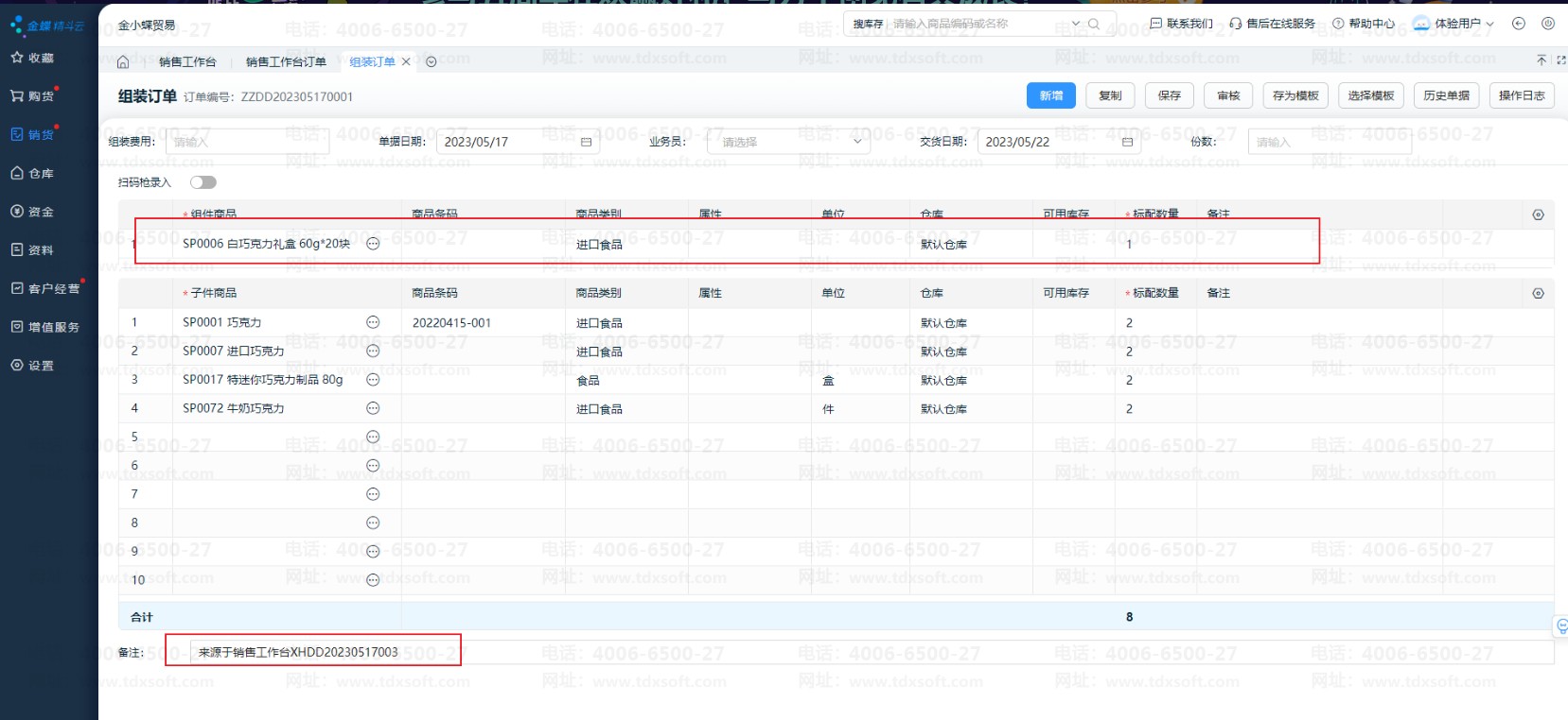若组件商品有创建组装模板,自动带出子件和组装数量