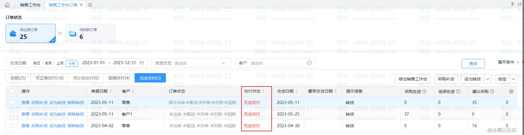 无法交付:设为缺货时交付状态变为无法交付,无法交付不会参与交货计算