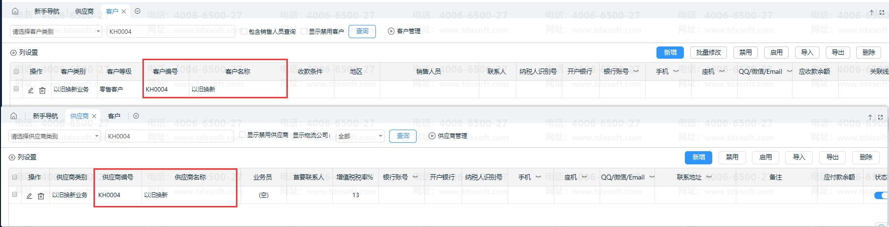 1、首先新增客户,勾选【客户/供应商】一起新增,即涉及以旧换新业务同是客户和供应商,后续处理往来核销。
