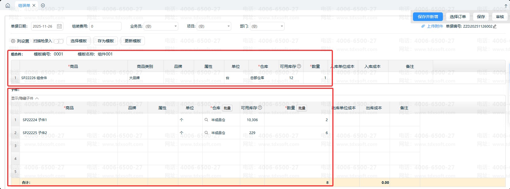 1、打开组装单编辑界面,点击【选择模板】,可预先设置好的组装单模板。点击【确定】后,带出模板商品信息(包括组件、子件、及数量配比关系);