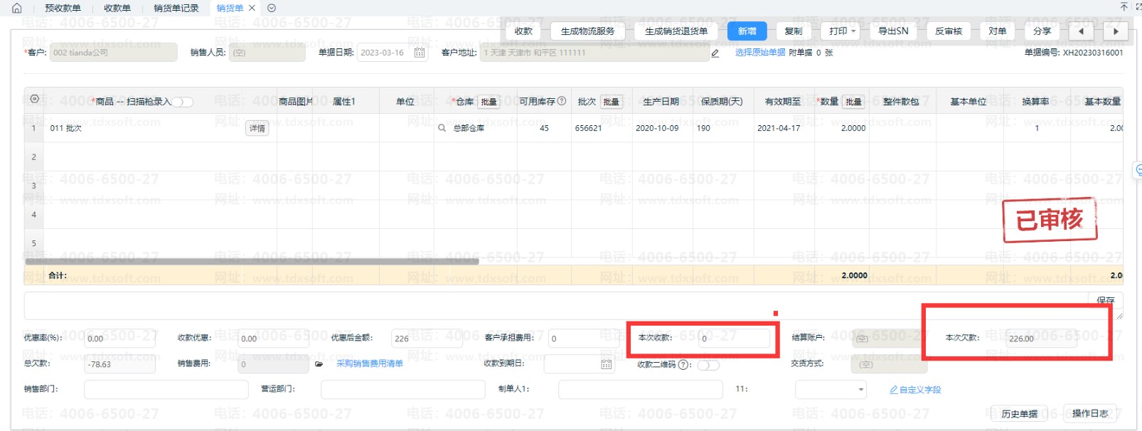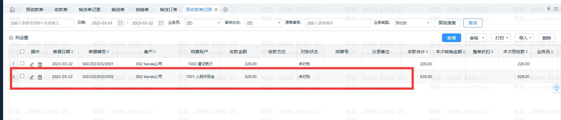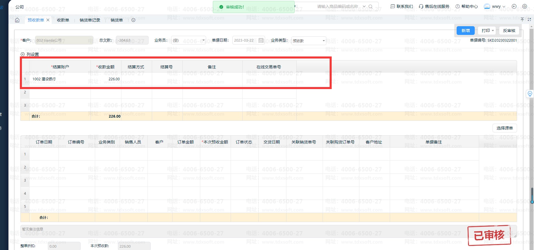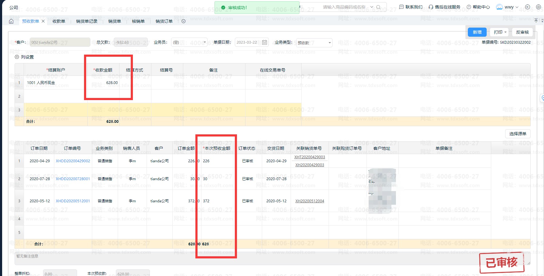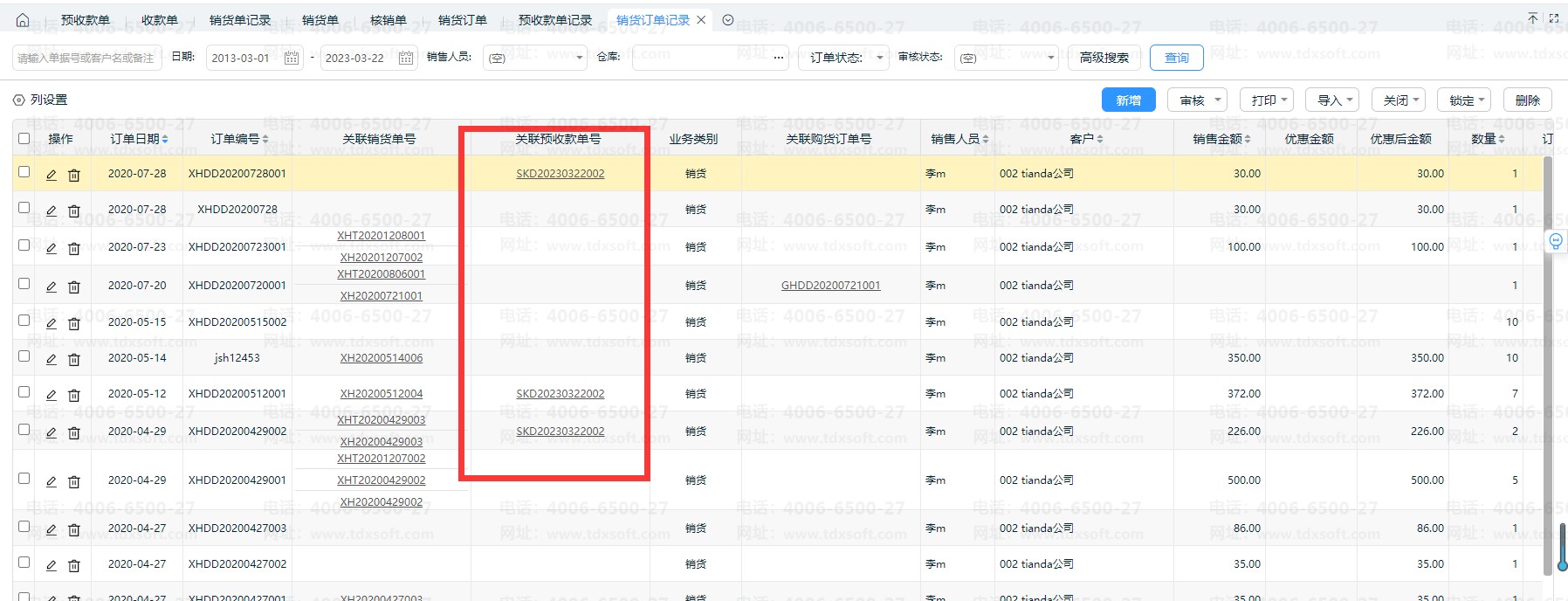 2.3、单据【保存/审核]后,在预收款单记录即可看到关联的销货订单。