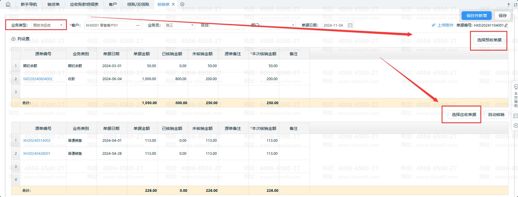 4.2、通过核销单的“预收冲应收”核销:新增核销单,业务类型选择【预收冲应收】进行处理。