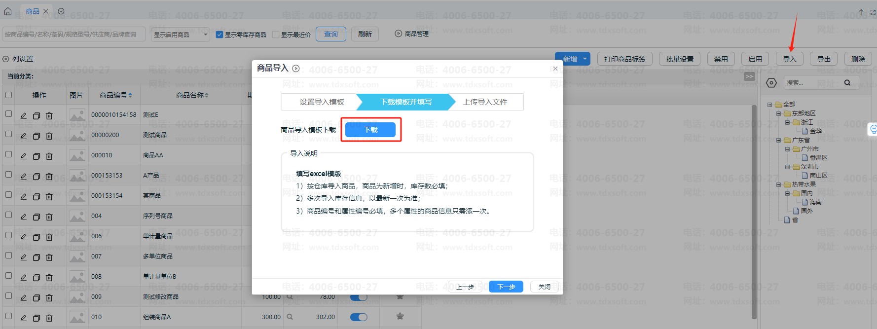 二、批量导入:在商品界面,点击右上角的按钮,下载模板并按模板格式填写后,再导入系统,如图: