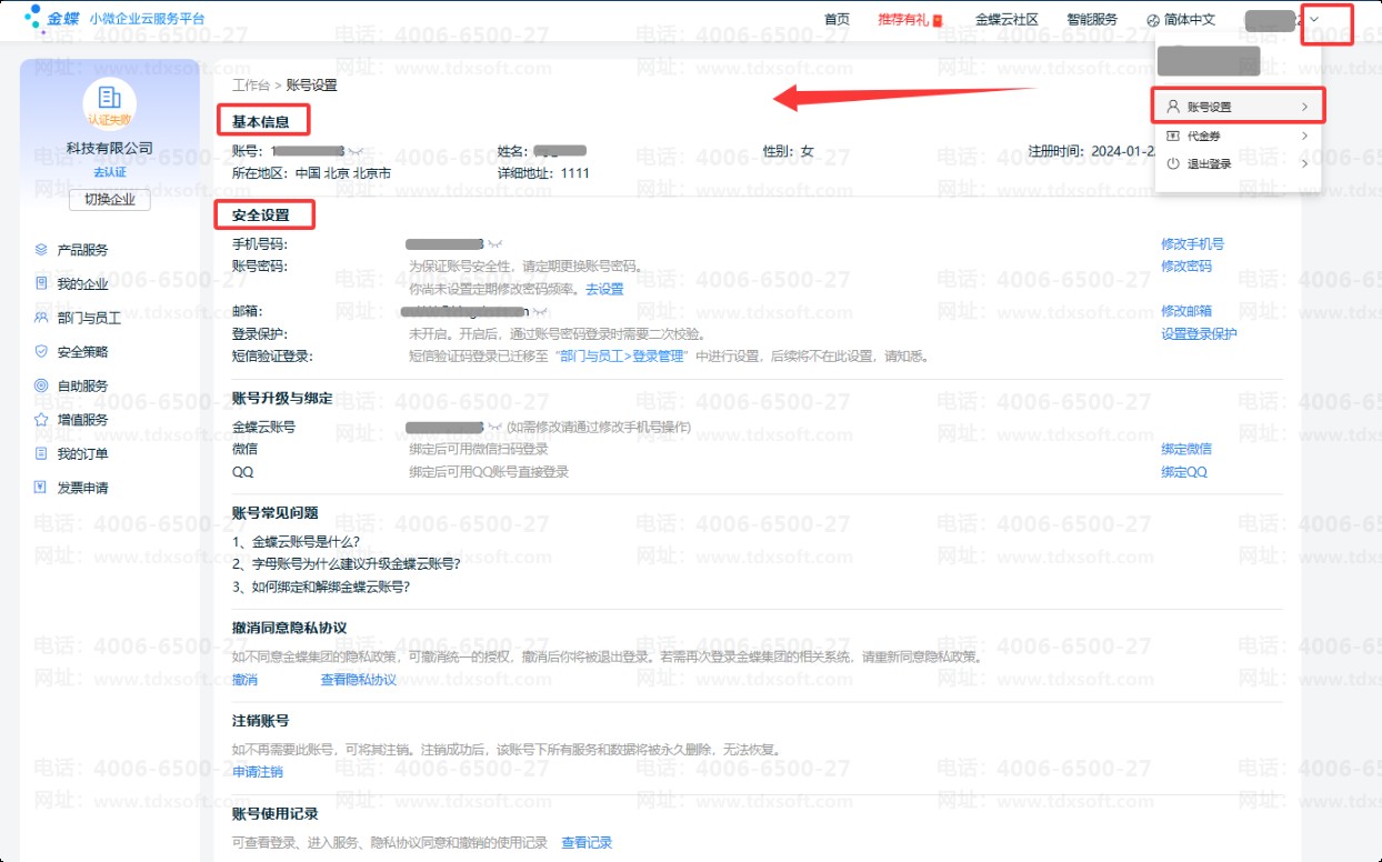 登录小微企业云服务平台(工作台),点击右上角的头像,选择【账号设置】,即可打开账号设置界面