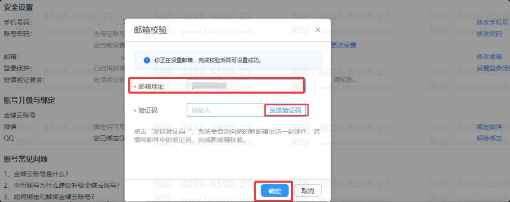 b、邮箱校验,输入新的邮箱地址(一个邮箱只能绑定一个账号),点击【发送验证码】,新邮箱会收到验证码,输入即可: