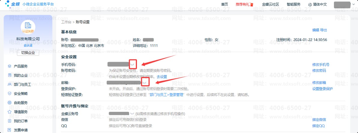 3、安全设置:当前账号绑定的手机号和邮箱,点击图标,可显示完整的手机号码和邮箱信息。