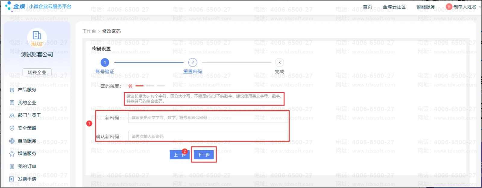 (2)设置新密码:注意密码组合要求,建议长度为8-18个字符,区分大小写,不能是9位以下纯数字,建议使用英文字母、数字、特殊符号的组合密码。例如123JDY@kingdee。