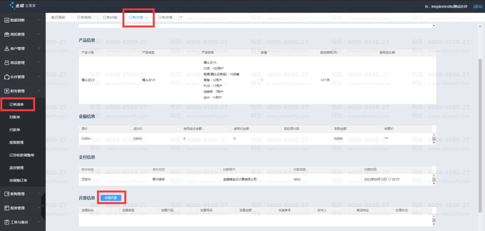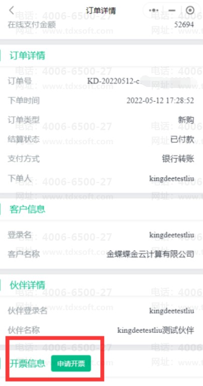 支持销售在云管家对还未开票的订单做开票申请,开票金额范围与下单时的结算金额一致。