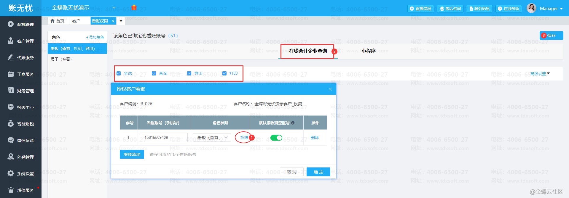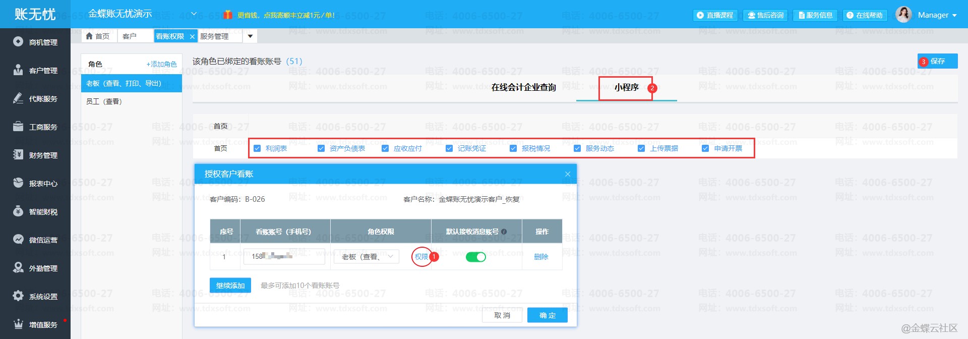 编辑使用小程序看账账号的权限,请参考下图路径: