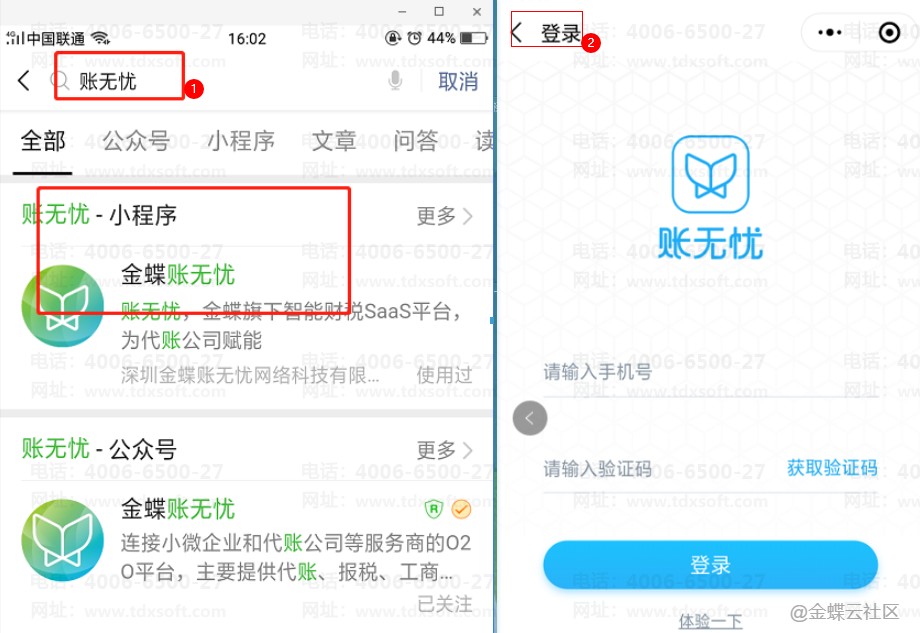 代账客户通过微信搜索“金蝶账无忧”小程序,输入登录账号(即看账账号),接收并录入短信验证码,点击“登录”。