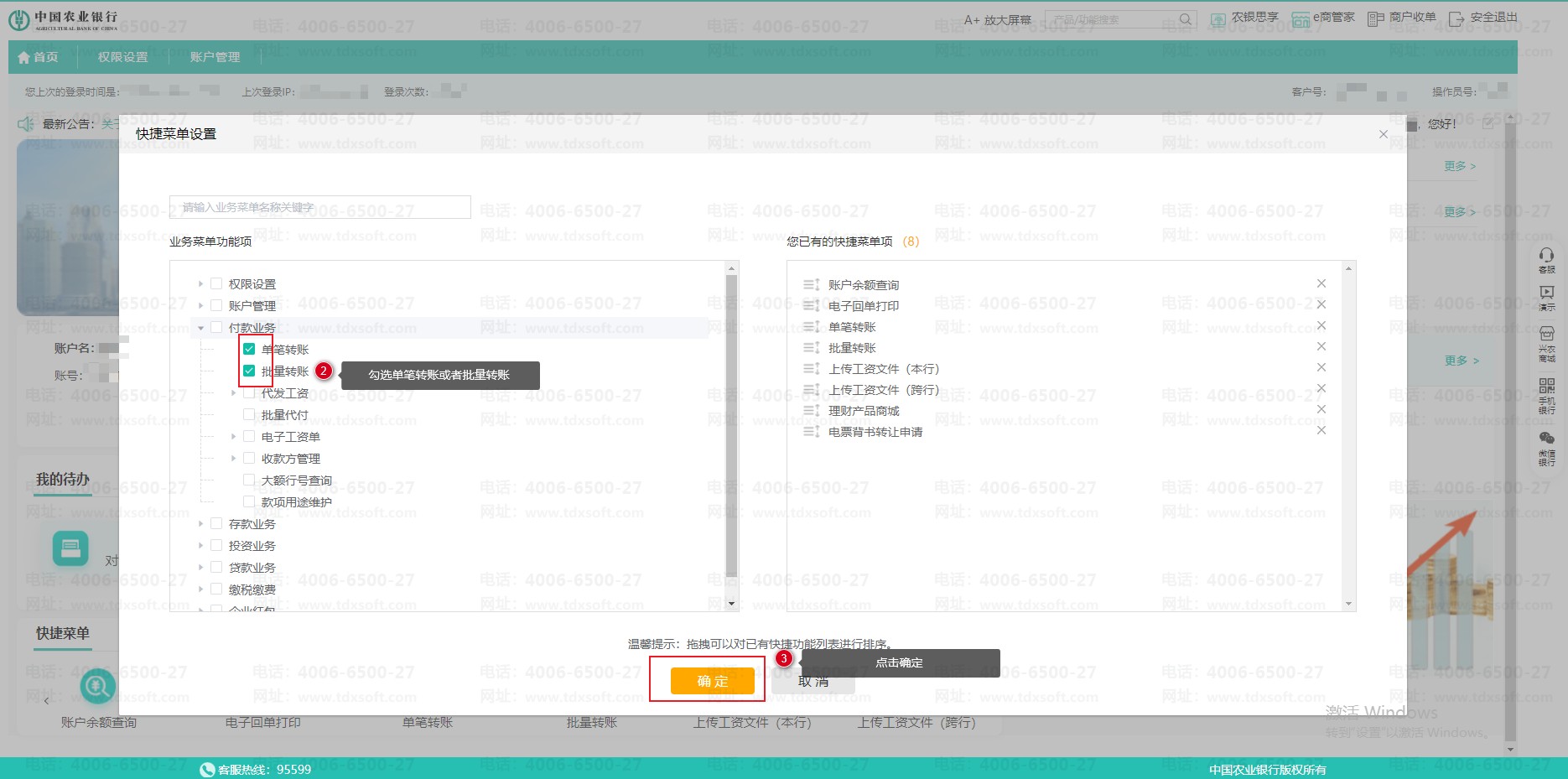 ③若没有菜单,则点击右上角设置,选择付款业务,勾选单笔转账或批量转账,点击确定。就可以在快捷菜单看到单笔转账、批量转账;