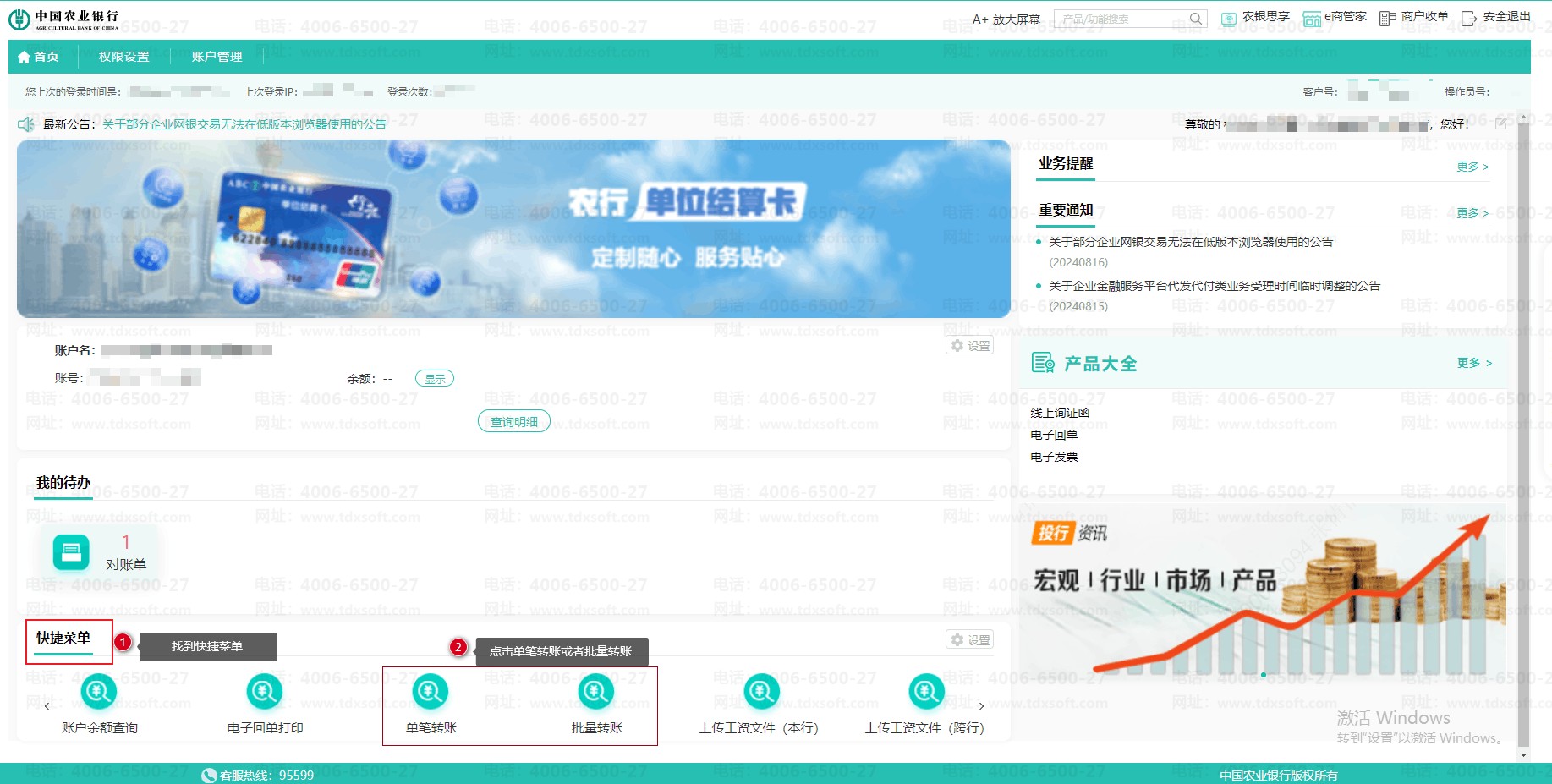 ④点击批量转账、单笔转账,弹窗提示如下,则为低版本企业网银,所以账号密码不会涉及转账交易,您可以放心!