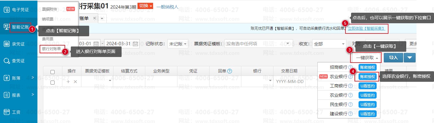 进入客户账套,点击【智能记账】→【银行对账单】,在银行对账单页面,点击【一键获取】按钮或顶部状态栏的【立即体验智能采集】,选择【农业银行】选项,弹出输入账密弹窗。