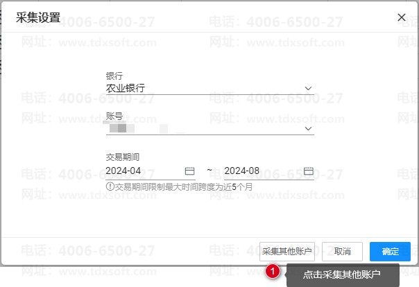 进入采集设置弹窗后,您可以选择需要采集的账户以及对应的交易期间,但由于农业银行限制,仅能采集近5个月的流水信息,比如当前自然月为2024年8月,则只能往前采集5个月的流水,即只能选择交易期间为2024-04~2024-08。