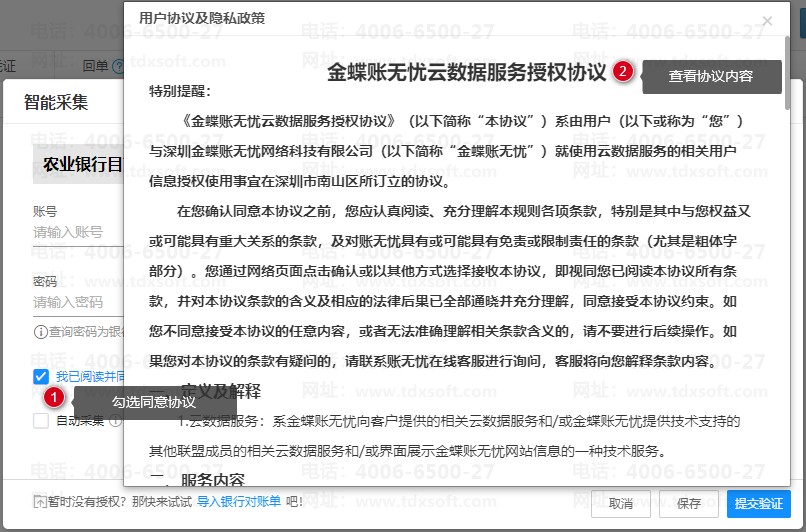 代账公司采集客户流水和回单需要线上授权,可查看《用户协议及隐私政策》,勾选后即视为同意授权账无忧平台代为查询客户银行流水等数据,同意授权后才可发起验证,协议内容如下: