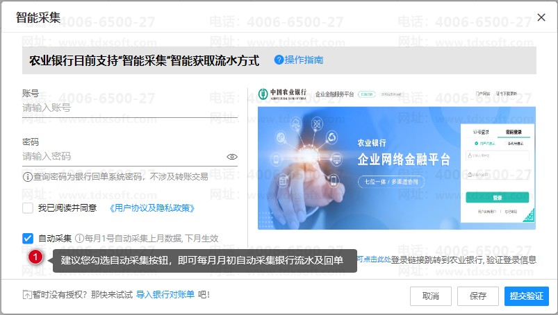 首次验证成功后,您可点击【一键获取】按钮或顶部状态栏的【立即体验智能采集】,选择【农业银行】选项,弹出采集设置弹窗。