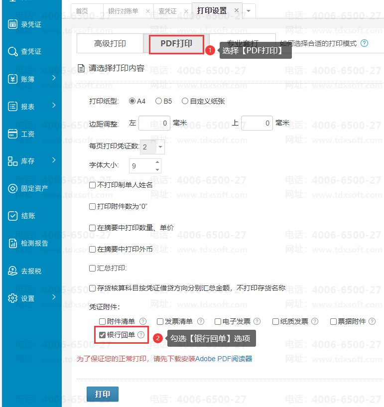 根据银行流水生成凭证后,您可进入【查凭证】页面,选择【打印】→【凭证打印】,选择pdf打印,在凭证附件选项处勾选【银行回单】,即可实现银行回单随凭证打印,无需手动整理裁切。