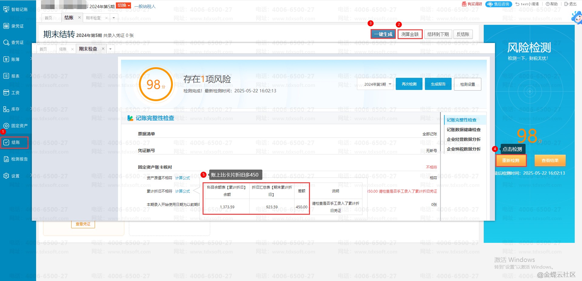 例如下图 , 通过【结账】页面右侧的【风险检测】出账卡数据不符 , 点击【计算公式】可查看到账上折旧比卡片折旧多了450。