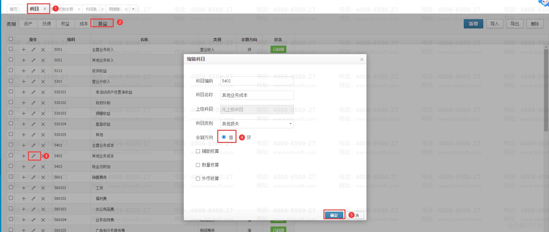 2、若确认是余额方向错误,需要先在【财务初始余额】界面删除错误方向科目的金额,点击【保存】按钮,再重新进入【科目】界面,找到对应的科目,点击编辑笔,修改余额方向,然后点击【确定】按钮,再到【财务初始余额】界面重新录入金额即可。