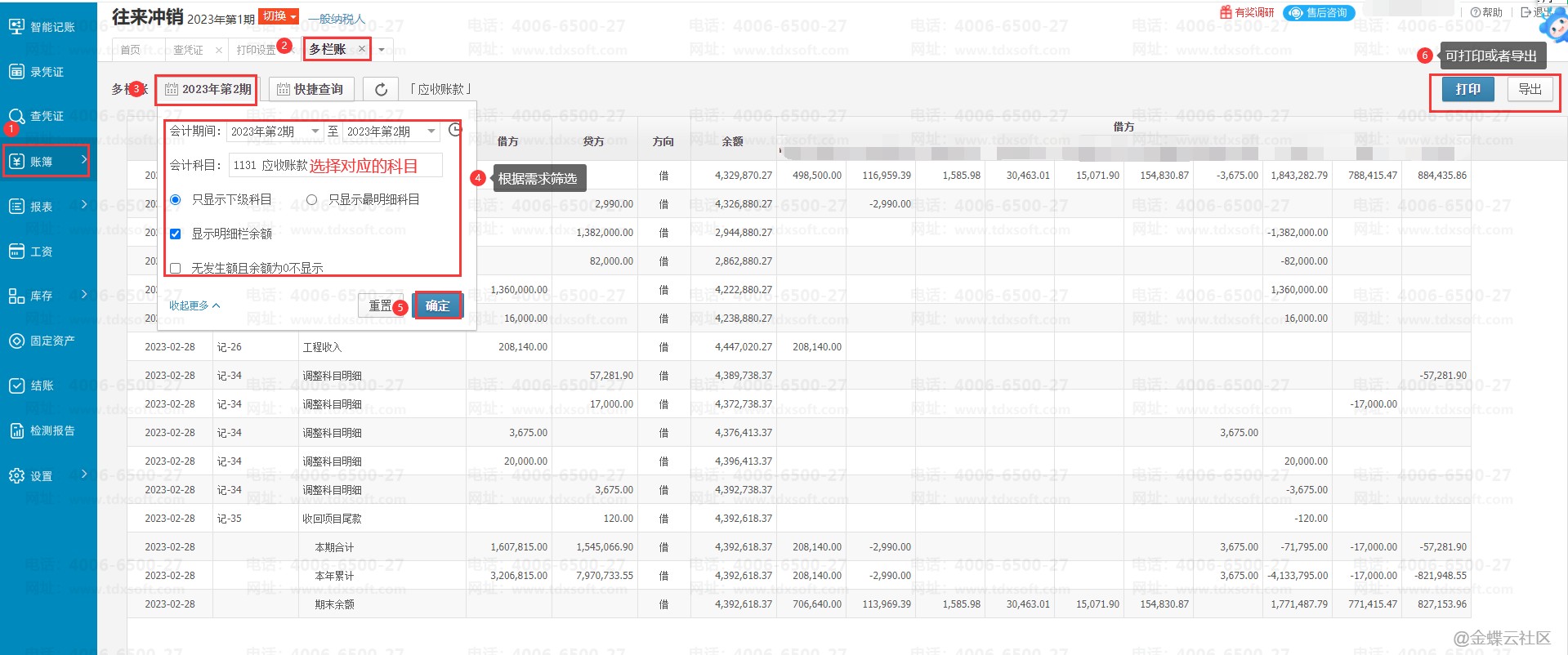 进入账套后选择【账簿】→【多栏账】,按所需条件筛选后点击【确定】即可查询对应科目的多栏账,然后点击【导出】/【打印】即可。