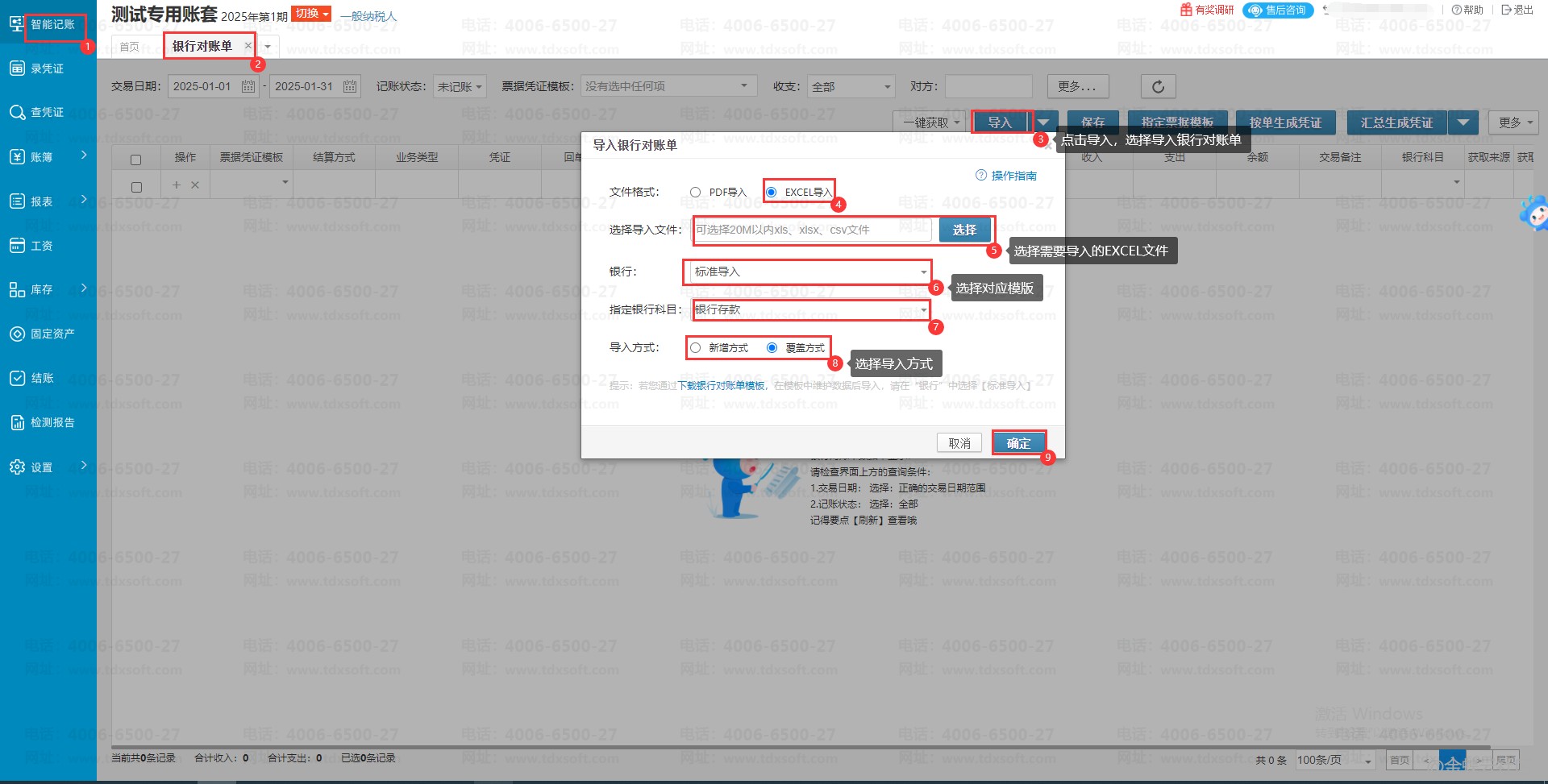 1.进入账簿点击【智能记账】 →【银行对账单】→【导入】选择导入银行对账单,在弹窗中,选择EXCEL导入方式,选择对应的银行EXCEL文件和导入模版,指定银行科目,选择对应的导入方式。选择完成后,点击【确定】
