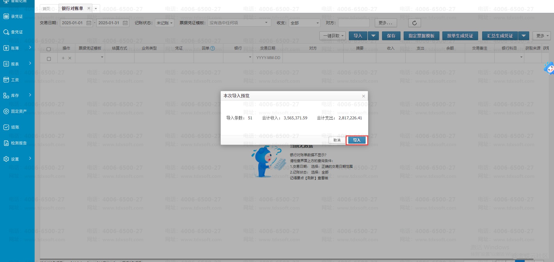 2.系统识别银行对账单表格数据成功后,会展示本次导入预览弹窗,显示导入表格中的汇总数据,确认数据无误就可以直接点击【导入】按钮