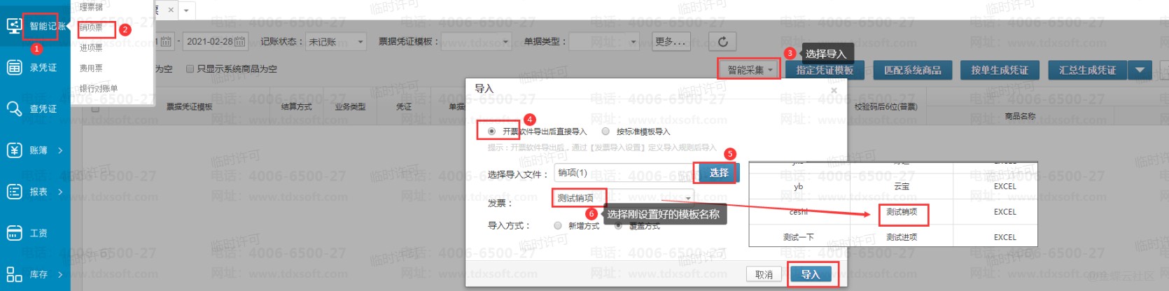 3、导入发票表格:【进账套】→【智能记账】→【销项票】→【导入】,注意选择对应的模板名称后,再上传表格导入即可。