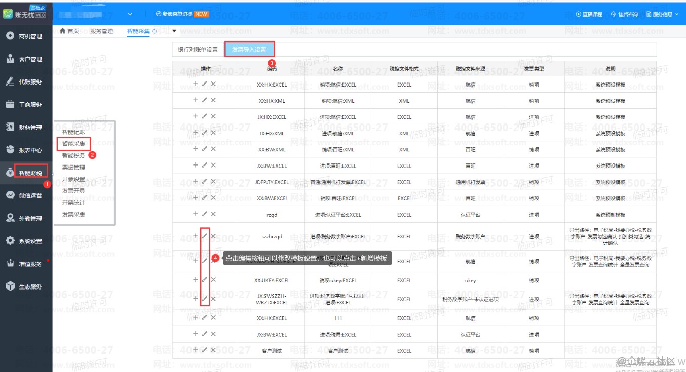 1 、登录账无忧首页,点击【智能财税】→【智能采集】→【发票导入设置】,选择对应的表格格式进行编辑模板;