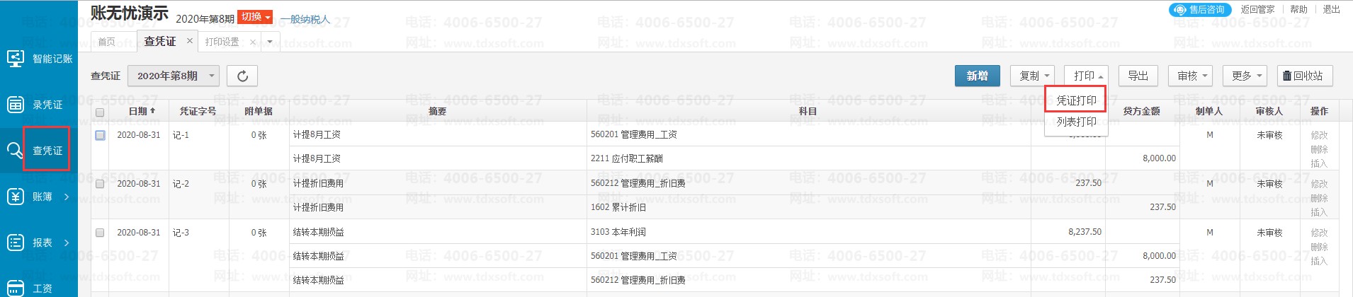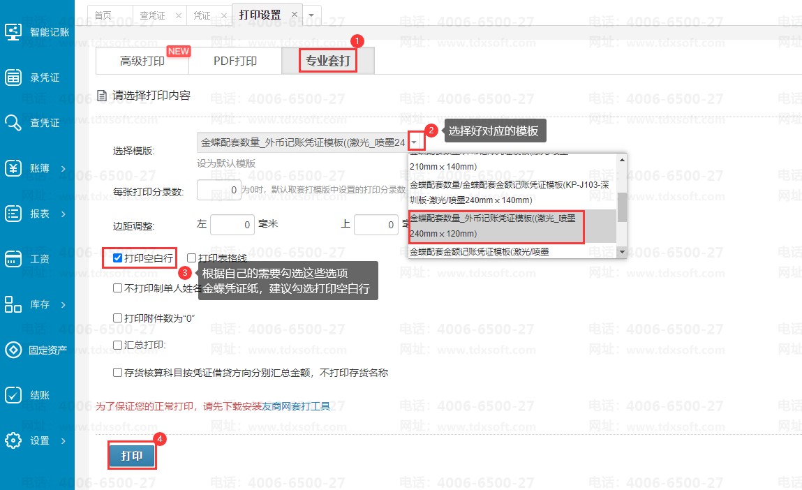1.进账簿后,进入查凭证界面,选择好需要打印的凭证,选择专业套打,套打模板选择【金蝶配套数量_外币记账凭证模板((激光_喷墨240mmⅹ120mm)】