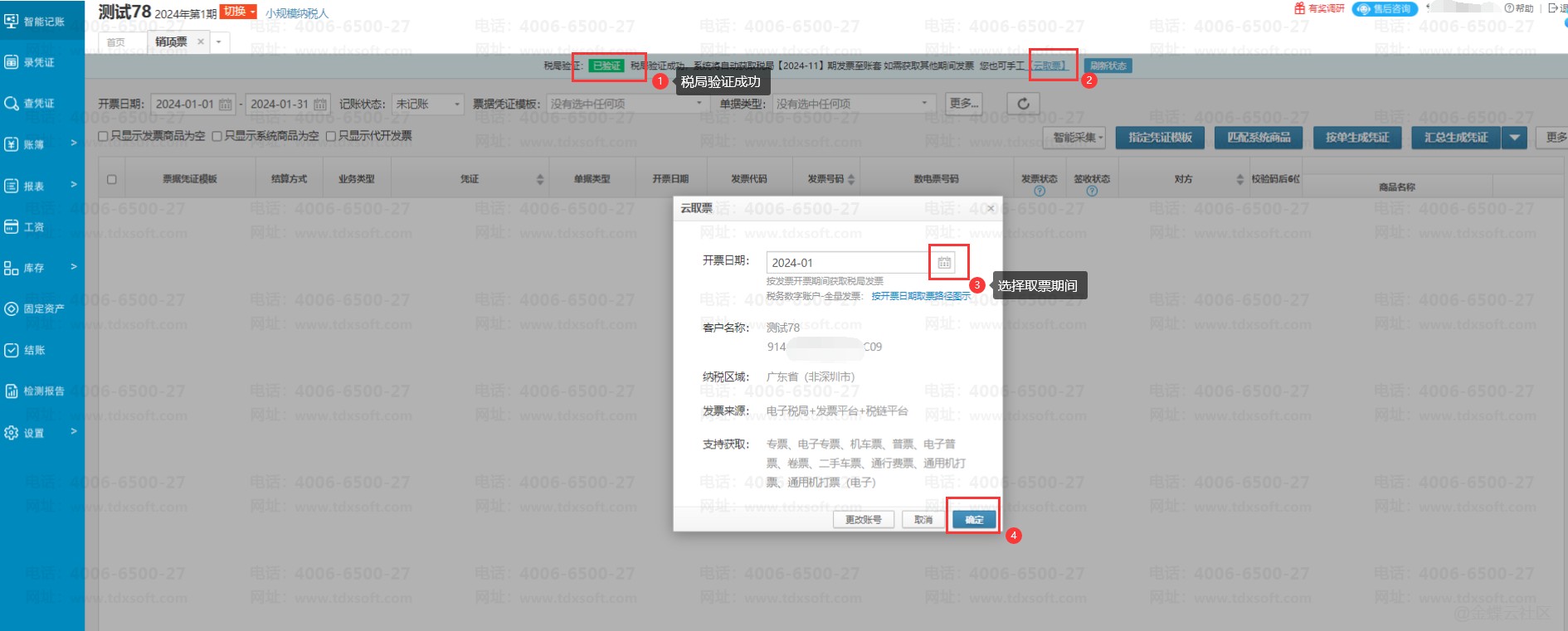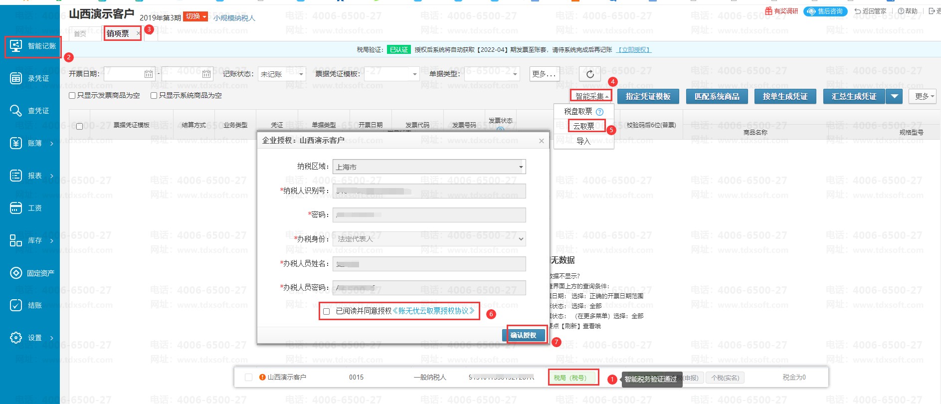 看到提示授权成功后,再次点击【智能采集】→【云取票】,在云取票弹窗中选择好取票的开票期间后,点击【确定】按钮后,系统即开始取票,取票成功后会出现提示取到票的张数和金额。