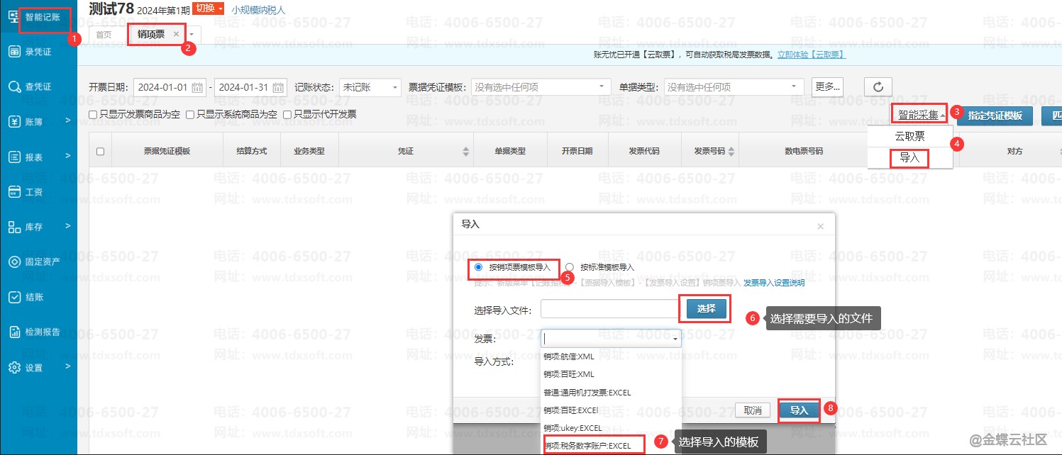 在税局税务数字账户中导出全量发票后,登录账无忧,进入账簿后点击【智能记账】→【销项票】,进入销项票界面,点击【智能采集】→【导入】按钮,在导入的弹窗中,选择【按销项票模板导入】,点击【选择】按钮,选择要导入的文件,在发票选项中,选择表格对应的发票模板名称,再选择导入方式后点击【导入】即可。