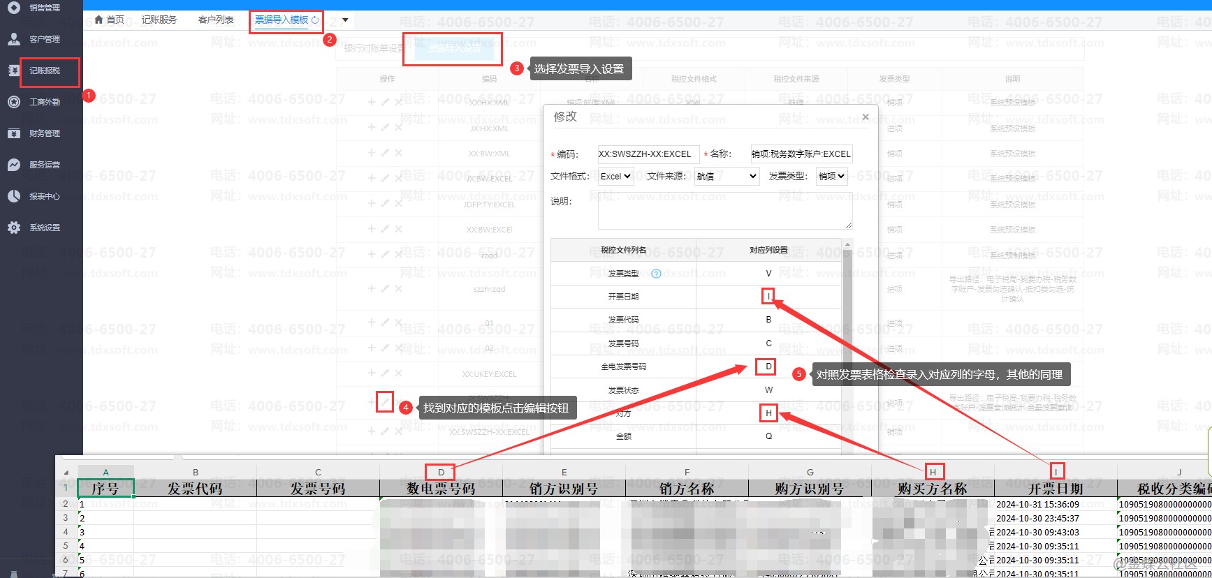 注:表格导入失败需检查表格是否与发票模板一致,检查发票模板设置,需在账无忧管家界面的【记账报税】→【票据导入模板】菜单下的【发票导入设置】中检查对应的模板设置。