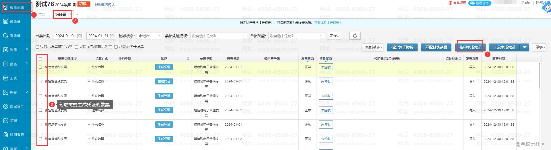 销项发票生成凭证可以选择按一张发票生成一张凭证或者是将多张发票汇总生成一张凭证。